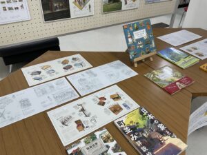 図書館1階の展示「ものがたりの家-吉田誠治美術設定集-」も、「校内読書週間」中の企画の一つです。ゲームの背景グラフィックを専門的に描く吉田誠治のイラスト集を展示します。正文館書店のご協力をいただきました。ありがとうございます。