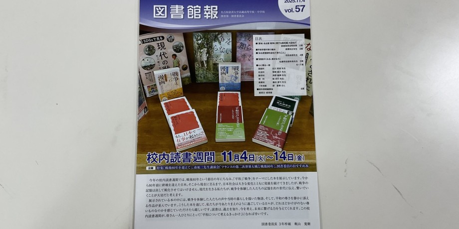 「校内読書週間」が、本日4日(火)から14日(金)まで開催されます。図書委員が企画テーマ「戦後80年を迎えて」に沿って、「戦争」「平和」に関するおすすめ本を選び、POPを作成し、それを展示しています。合わせて、11月の企画展示でも、「戦後80年」に関する書籍を紹介しています。