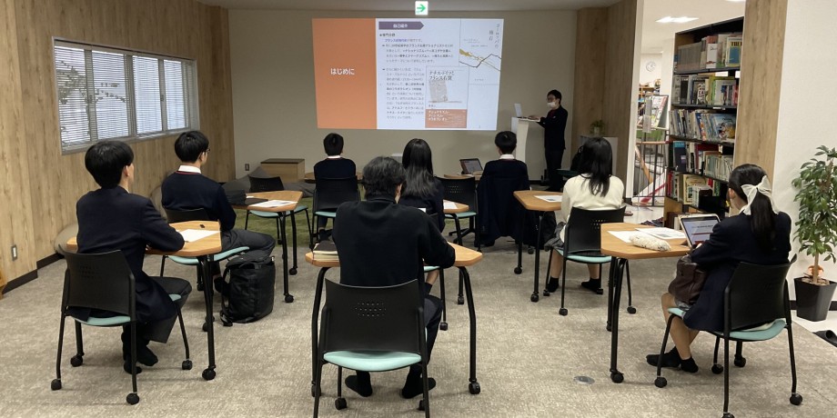 11月4日(火)の放課後、「校内読書週間」の始まりに合わせて、「戦後80年」に関する特別講演会が、図書館2階・多目的コーナー【サクラボ】で開催されました。南山大学国際教養学部の南祐三准教授を講師にお招きし、「フランスの第二次世界大戦と戦後80年」というテーマで話していただきました。