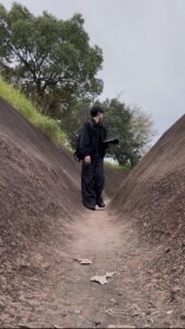 環濠の高さを自らの身長と比べている、本校教員の姿をパシャリ。