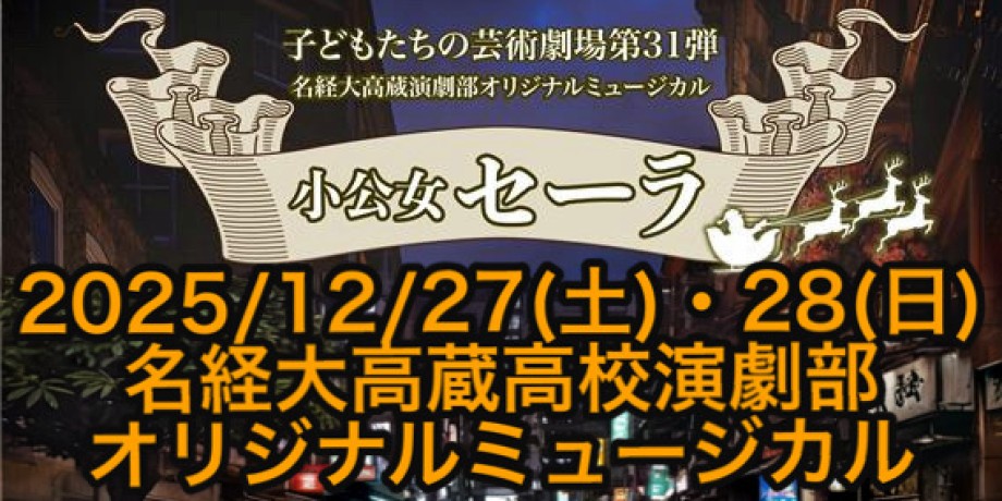 | 演劇部は、瑞穂文化小劇場にて12月27日(土)・28日(日)の2日間、オリジナルミュージカル小公女セーラを公演いたします。チケット不要で入場できますので、本校演劇部の活動に興味がある方やご都合が合う方はぜひ観に来ていただけると嬉しいです!また、施設の駐車可能台数に限りがありますので、ご来場の際はできるだけ公共交通機関をご利用いただきますよう、お願い申し上げます。