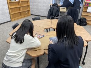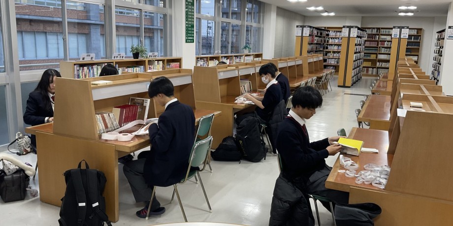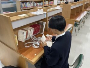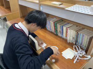 本日は、2学期最後の授業日でした。放課後の図書館では、図書委員が蔵書管理の作業を進めていました。また、商業科2年生が多目的コーナー【サクラボ】で、明日18日(木)から始まる販売実習「ういろうをういろうよ!」の準備を行っていました。