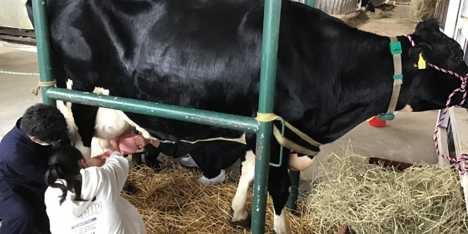 カヌーのあとは搾乳体験。バスで藤田牧場に移動し、乳牛や牧場の仕事について学びました。私たちが訪れる1時間前に産まれたという子牛の姿も。近代化された牧場の中を見学し、実際に搾乳。恐る恐る乳牛に近づき触れた乳の温かさに感動していました。最後は新鮮な牛乳とアイスクリームをご馳走になりました。
