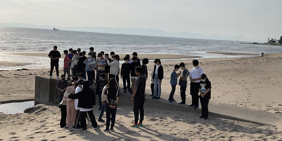 「恩師への手紙」「クラス目標発表準備」「校歌・エアロビ練習」を終えてみんなで海岸へ。美術の課題『何かに見える石』探し。