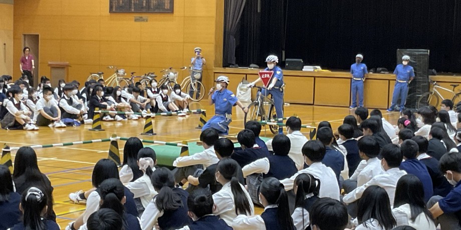 本日、中学校1・2年生と高校1年生を対象に自転車マナー講習会を行いました。愛知県警察本部自転車部隊の皆様に講師をしていただき、自転車が道路のどこを走るのが正しいのか、今年度の4月から着用努力義務となったヘルメットの被り方などを実際に守らなかったらどのようになるか実演いただきながら実践的に学ぶことができました。