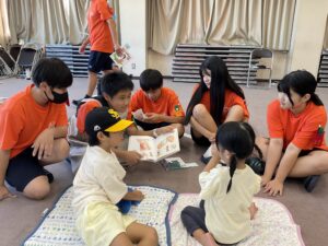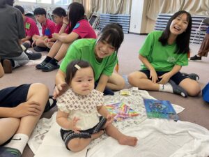 続く、第6時限では、「赤ちゃん抱っこ体験」が行われました。参加していただいた5組の母子に、生徒たちが乳幼児に絵本を読み聞かせしたり、自作のおもちゃで遊んだりしました。楽しそうな声が教室に響いていました。