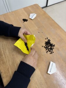 東京藝大から送っていただいた一袋の薬方包みの中には30粒の種が入っていました。1粒を2人で担当していた種が、最後は30粒51袋、数にすると1500粒以上になりました。その様子はとても感慨深いものでした。