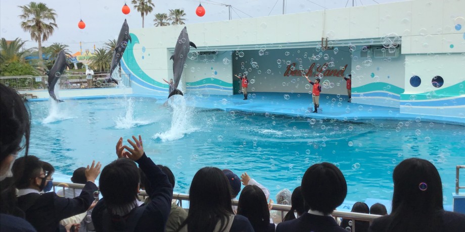 例年実施していた乗鞍での合宿オリエンテーションの代替行事として、南知多ビーチランドへ遠足に来ました。アシカ・イルカショーを見学した後、水族館のバックヤードツアー。魚たちのエサを見せてもらったり、ウミガメとの触れ合いもできました。
